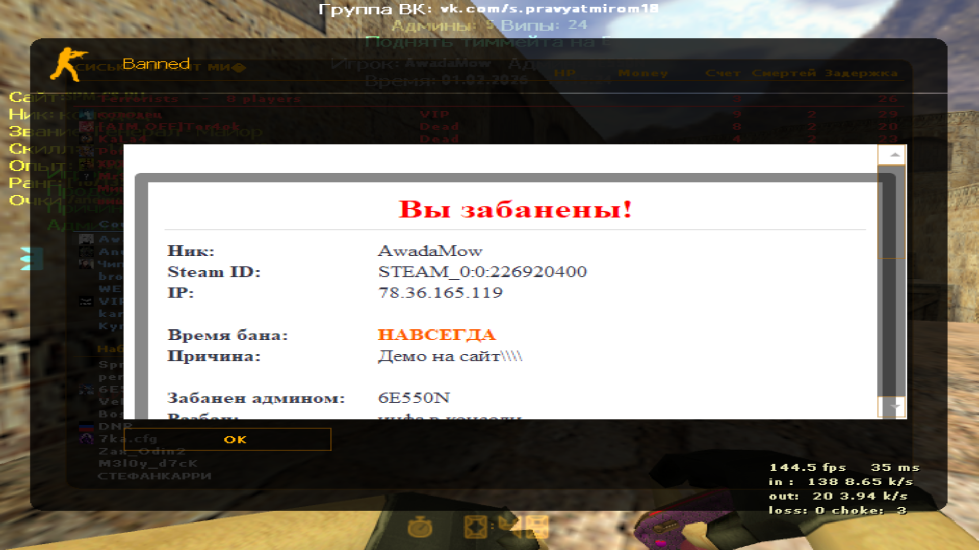 [Админ] Вы были забанены на этом сервере админом 6E550N